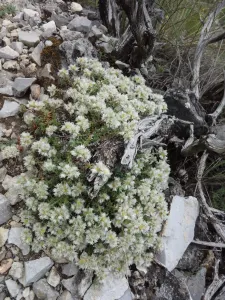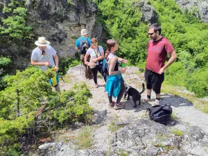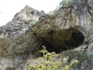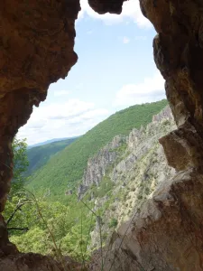 В един момент видяхме дупка/халка в скала наблизо и отидохме да я разгледаме, пътечката продължи и зад завоя на скалата и отвежда до една от по-големите пещери в каньона. Там направихме обедна почивка на затревен участък под пещерата, на хладна сянка скрити от напичащото слънце.